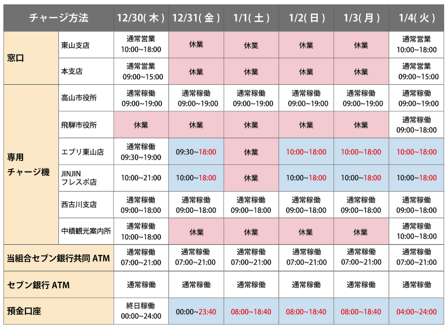 年末年始は、専用チャージ機の稼働時間や預金口座チャージをご利用いただける時間帯が通常と異なります。