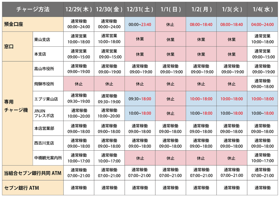 2022.12.23 年末年始のチャージに関するご案内 平素はさるぼぼコインをご利用いただき誠にありがとうございます。 年末年始は、預金口座チャージをご利用いただける時間帯や、チャージ機の稼働時間が通常と異なります。 以下をご確認いただき、お早めのチャージをお願いいたします。 お客さまにはご不便をおかけいたしますが、何卒ご理解いただきますようお願い申し上げます。 各チャージ方法の稼働スケジュール 本件に関するお問い合わせ先 飛騨信用組合 経営企画部 TEL:0577-32-8988 Mail:support_coin@hidashin.co.jp