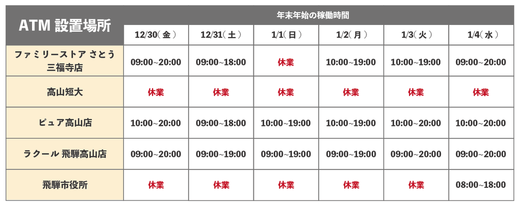 また、以下の店外ATMにつきましては、年末年始の稼働時間が変更となりますのでご注意ください。