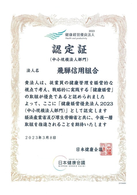 飛騨信用組合は、2023年3月8日(水)、経済産業省および日本健康会議が実施する「健康経営優良法人認定制度」において、「健康経営優良法人2023(中小規模法人部門)」に認定されました。