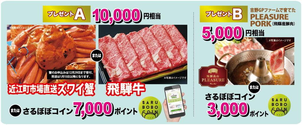 1等から3等についてはさるぼぼコインポイントカードの手交をもって発表に代えさせていただきます。 - 当選番号及び懸賞抽選権