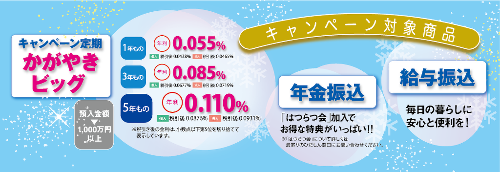 - 【かがやきビック】キャンペーン金利は初回満期日までの適用とし、初回満期日以降の金利は満期日当日の(ミニ)スーパー定期、大口定期の店頭表示金利を適用します。