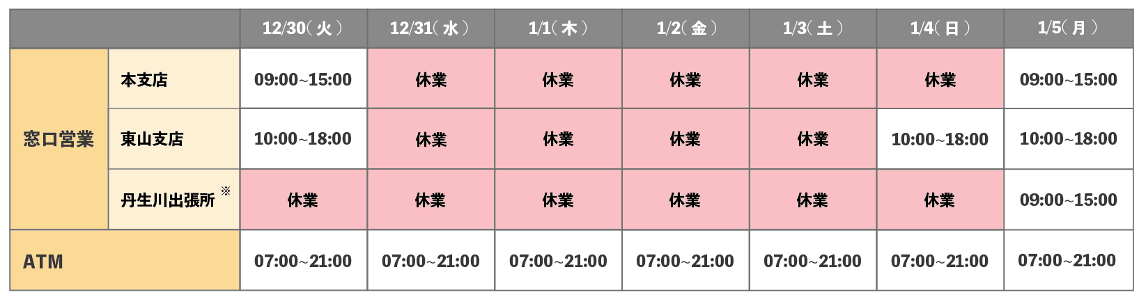 年末年始の窓口およびATMの営業に関するご案内
