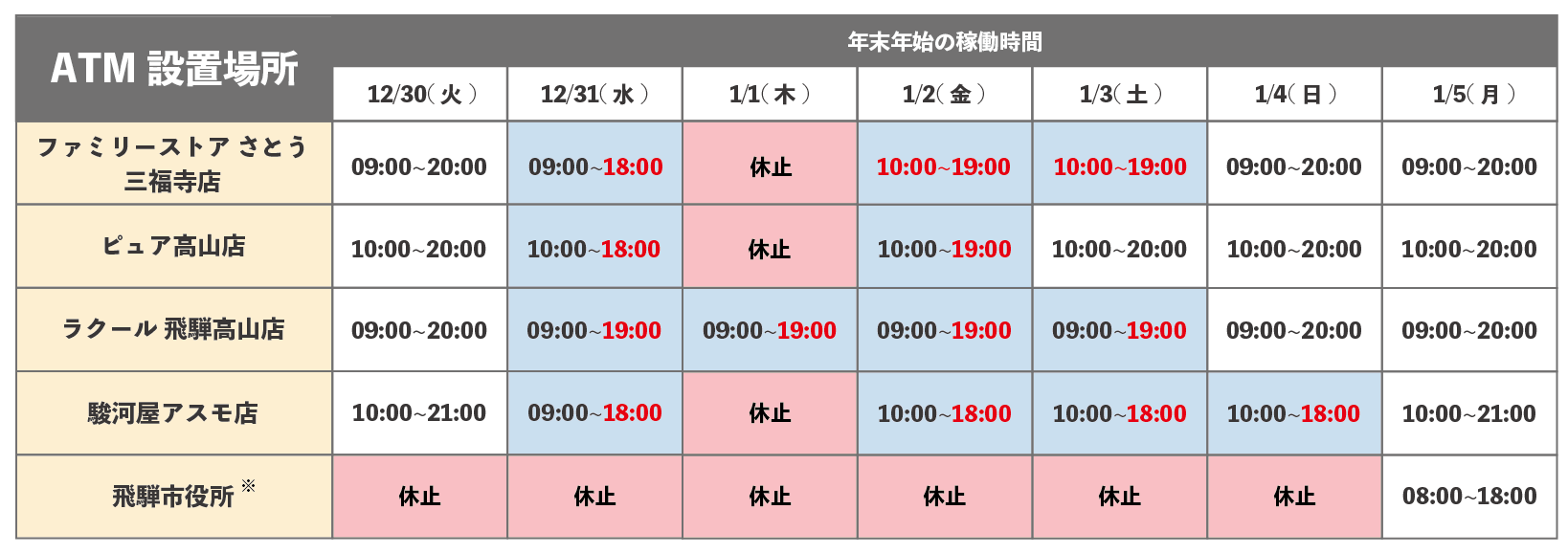 なお、以下の店外ATMにつきましては、年末年始の稼働時間が通常と異なりますのでご注意ください。